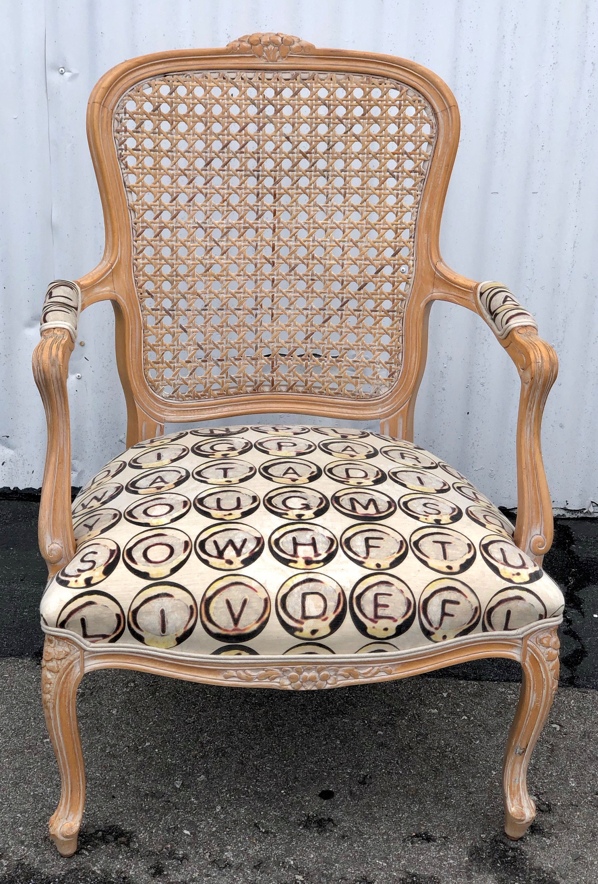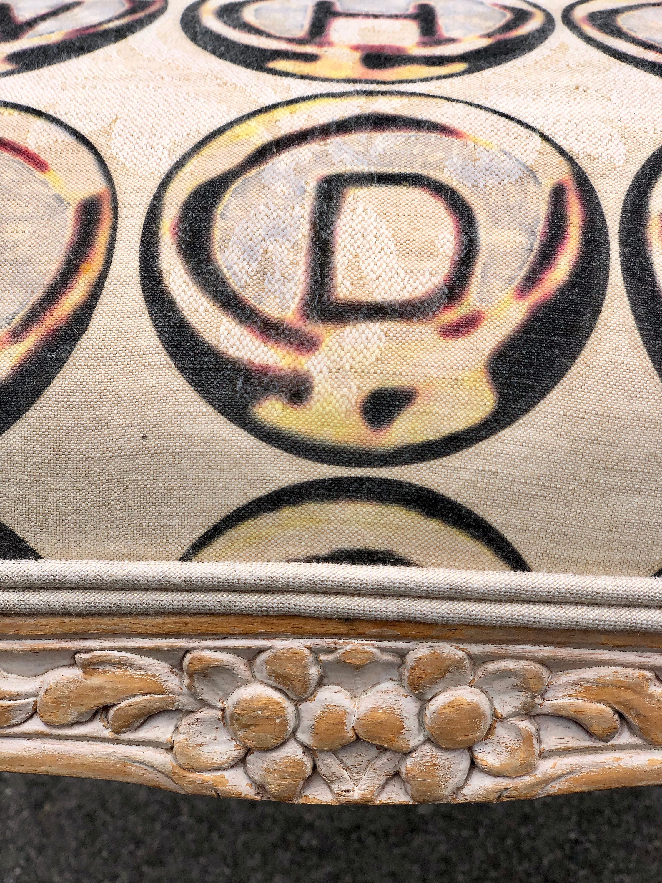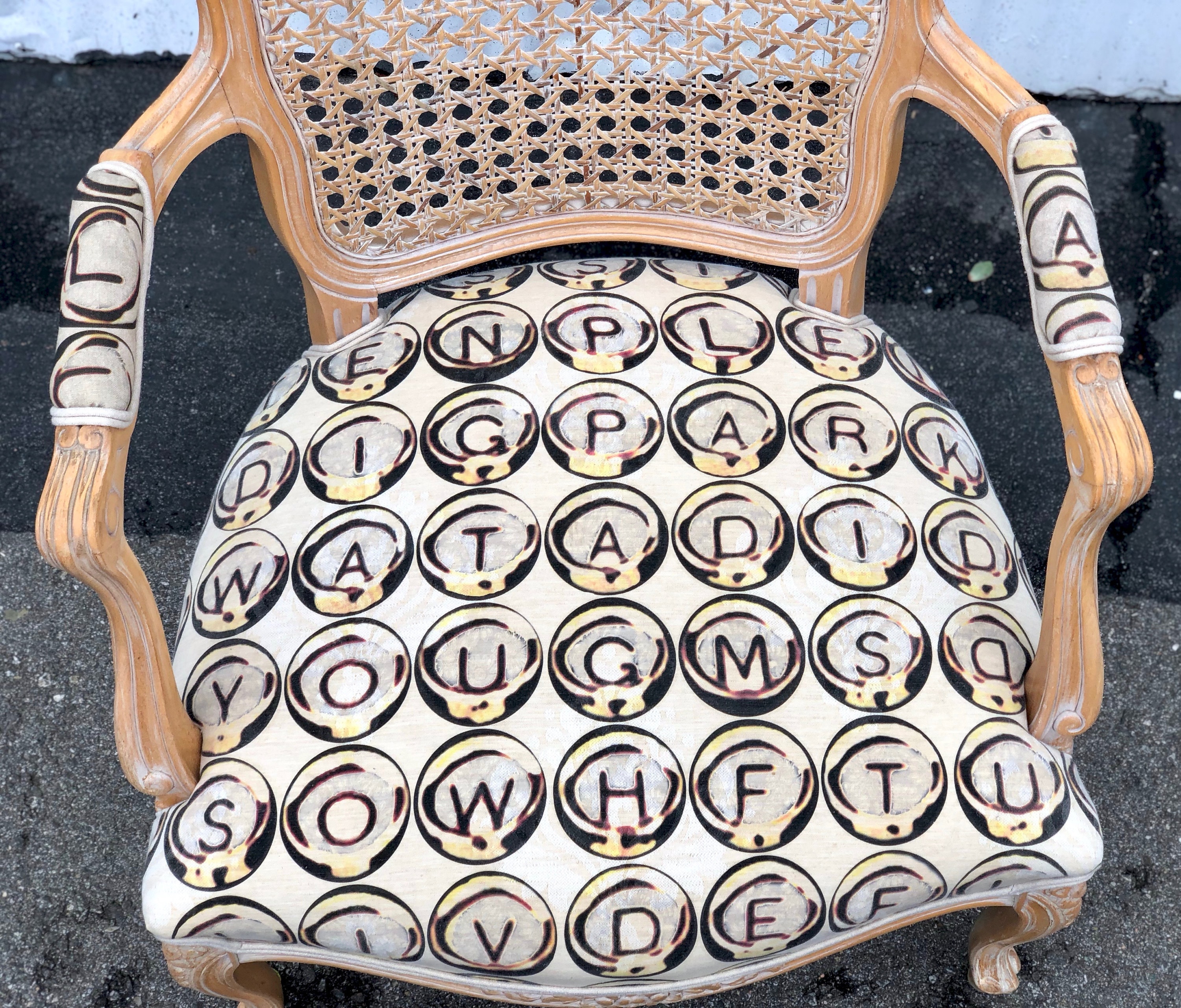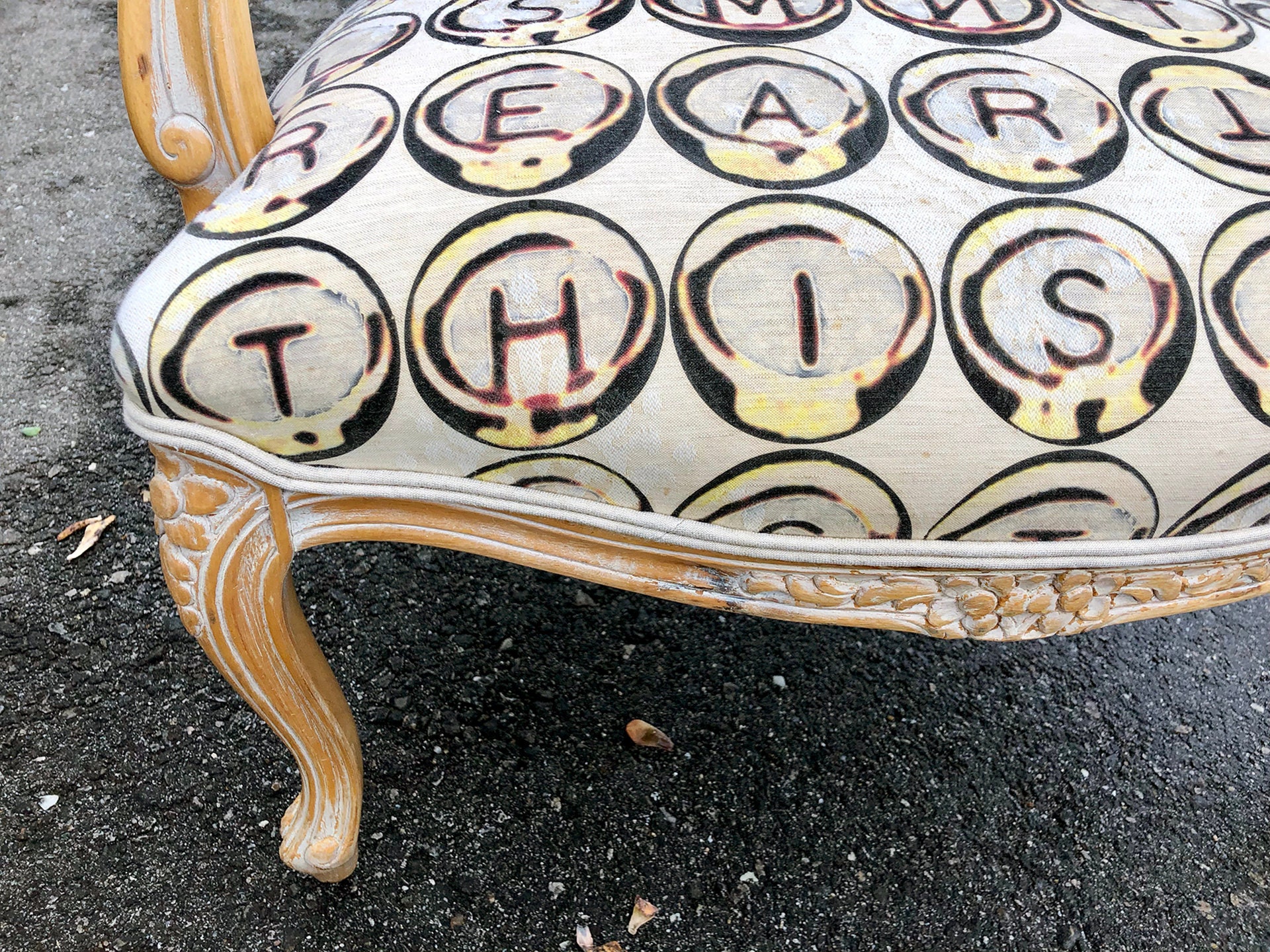 I printed the keywords and Ernesto upholstered them with double cord trim. They are perfectly finished. He even made each little arm cushion have L on one side and A on the other!
